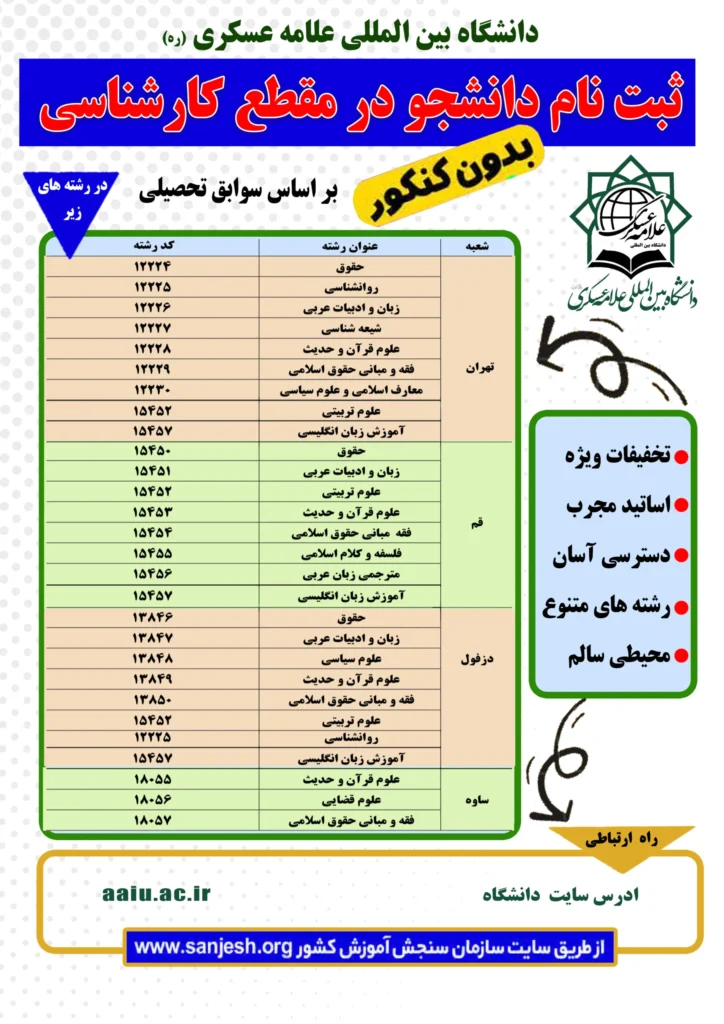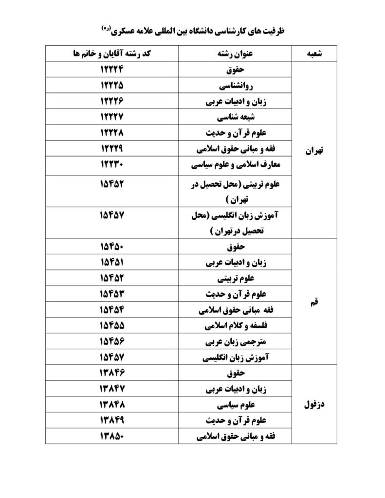 📚 ظرفیت های کارشناسی دانشگاه بین المللی علامه عسکری(ره) در رشته های :